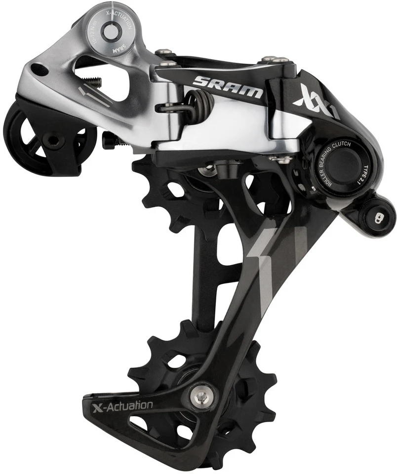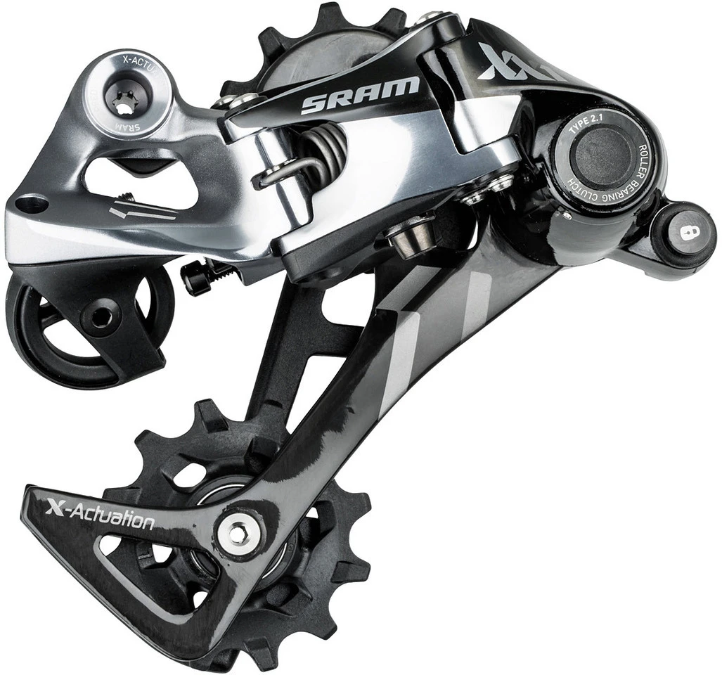Bei den neuen Schaltwerken der Reihen X0 und X9 sorgt die Roller Bearing Clutch Technology dafür, dass der Käfig Spannung aufbauen kann. Eine nadelgelagerte Kupplung verhindert allzu leichte Vorwärtsbewegung, die Kette bleibt gespannt und schlägt nicht gegen die Strebe. So wird auch ohne Kettenführung an der Kurbel ein Abspringen der Kette sicher verhindert.